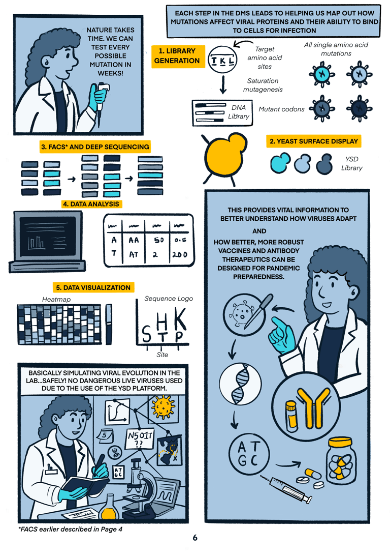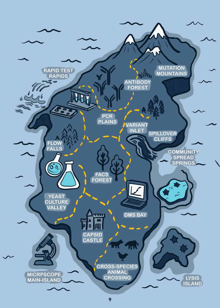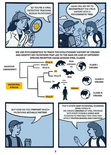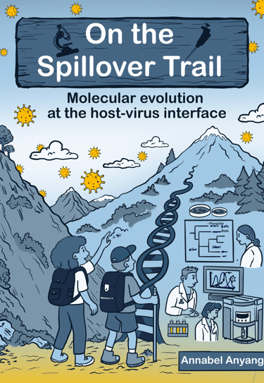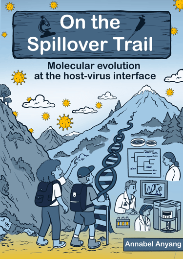 On the Spillover Trail is a science comic that turns my research on viral evolution and zoonotic spillover into a playful, illustrated journey. Two grad students hike through a science-themed landscape exploring how viruses adapt, cross species, and cause disease outbreaks—explained through metaphors, humor, and colorful visuals. Designed for curious readers of all backgrounds, this comic makes complex virology accessible, relatable, and fun.