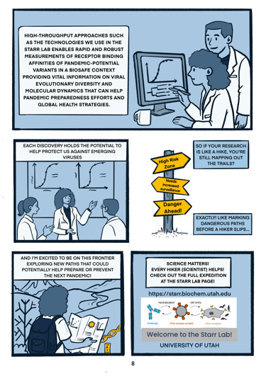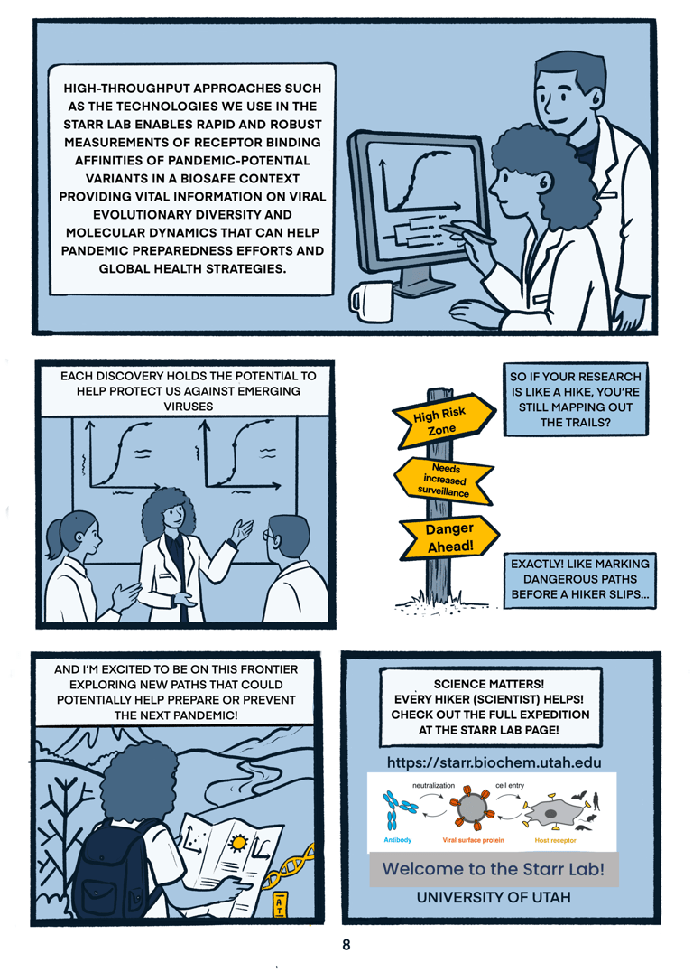 Created for the Utah Science Communication Hackathon, this short comic follows the journey of a virus as it crosses species boundaries — illustrating the process of zoonotic spillover in a way that’s both engaging and educational. Using metaphor and microbiology, the comic breaks down how viruses adapt to new hosts, and why understanding spillover is essential for pandemic preparedness.